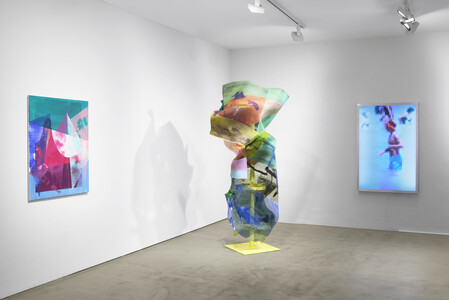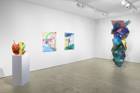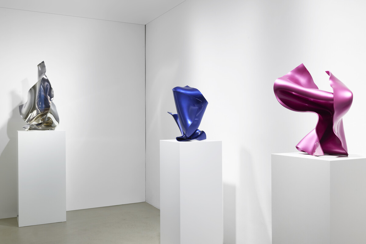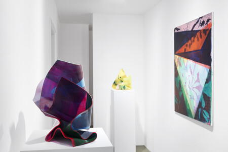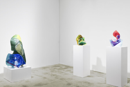 Zentral in der Ausstellung sind neue, vertikal verschraubte Plexiglas-Skulpturen, deren farbige Schichtungen und Reflexionen barock anmutende Faltenwürfe evozieren. Die Plastiken changieren zwischen Leichtigkeit und Dramatik, zwischen serieller Setzung der Farbe und der Raumwirkung skulpturaler Körper. Neu hinzu kommen Kleinplastiken mit metallisch spiegelnden Oberflächen, die unmittelbar auf ihre Umgebung reagieren, sowie farbig bedruckte Varianten, deren leuchtende Schnittkanten den Übergang von Fläche in Raum betonen.
